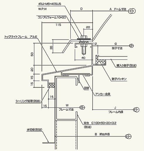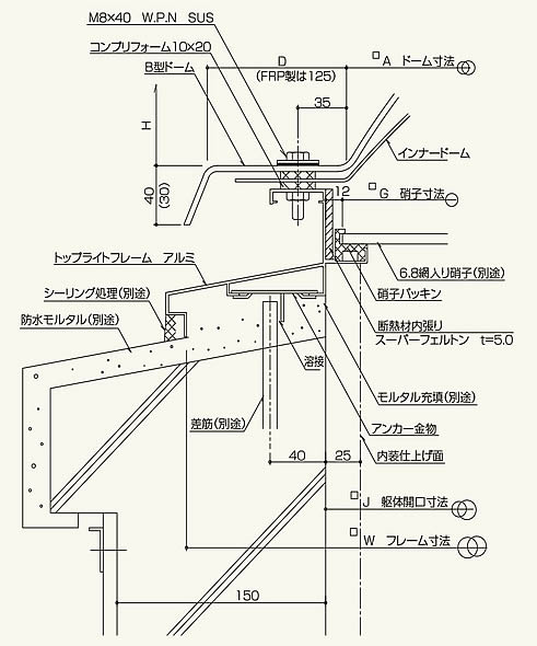 - 耐火性能を持つ網入りガラスと組合せ、アルミフレーム内側にステンレス枠を取付けた構造で、建築基準法に準拠したサントップドーム用30分耐火仕様です。